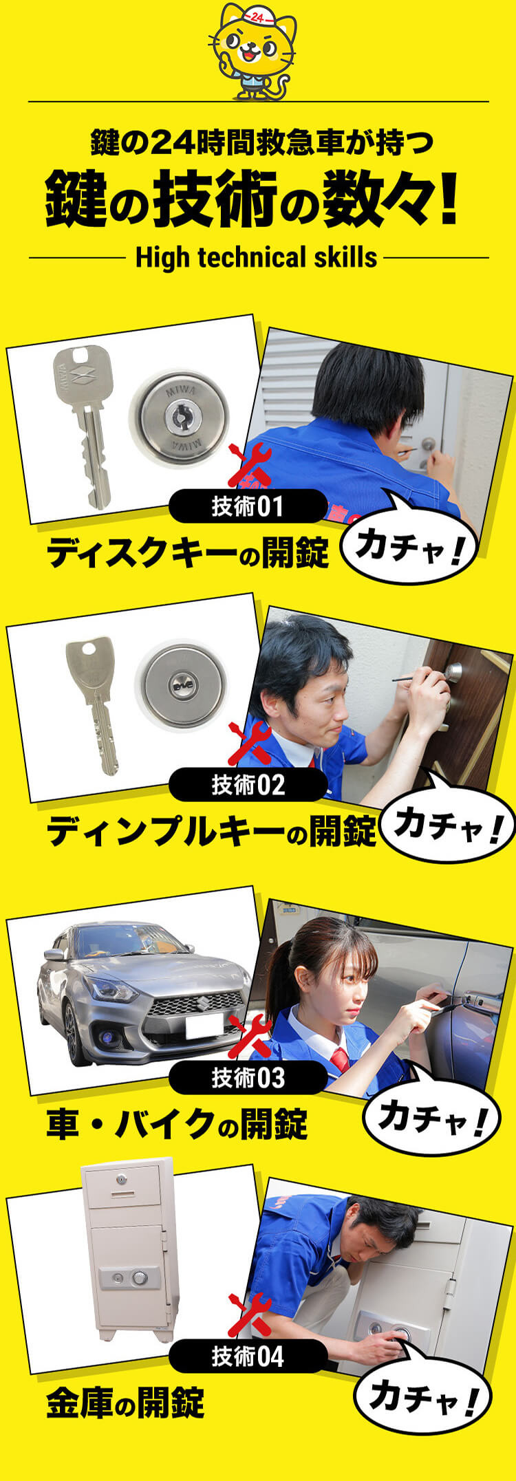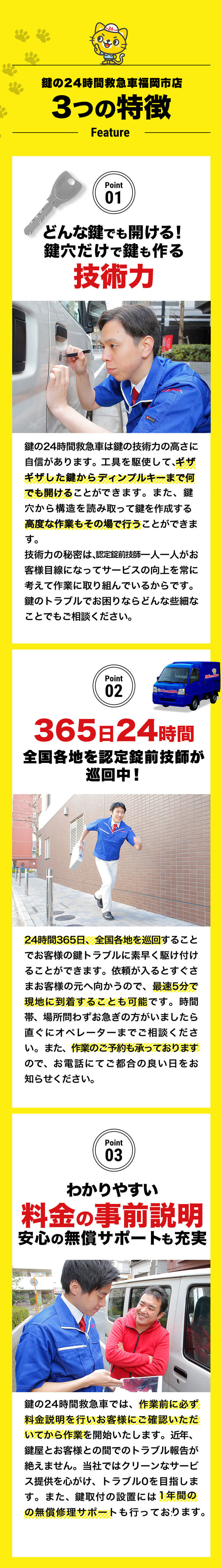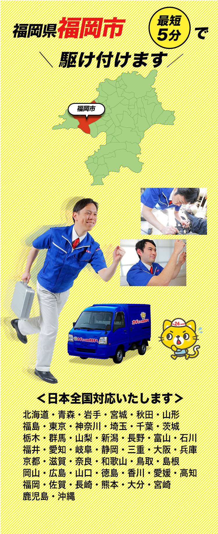 福岡の「カギの出張24時間」は、博多や天神地区で迅速に鍵のサービスを提供。地元住民から観光客まで、すべてのお客様に安心と安全を届けるため、24時間365日体制で対応します。福岡で信頼できる鍵屋が必要な時、当店が解決します。